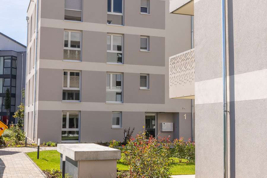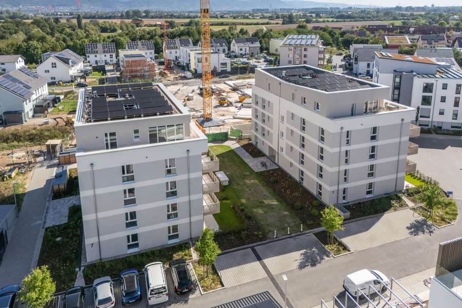 Unser Bauvorhaben green v Viernheim erreicht die Klassifizierung Klimafreundliches Wohngebäude mit QNG und wird mit dem besonderen Förderprogramm 297/298 der KfW-Bankengruppe unterstützt. Es qualifiziert sich dadurch für ein außergewöhnlich gutes Zinsprogramm, das erhebliche Kosteneinsparungen für Sie als Käufer mit sich bringt. Beim Erwerb einer Erstimmobilie können Sie dank"Hessengeld" bei der Grunderwerbssteuer sparen. Der erste Bauabschnitt ist abgeschlossen. Wir bieten in zwei Gebäuden einen attraktiven Wohnungsmix mit 2-4 Zimmer Eigentumswohnungen und Wohnungsgrößen von 79m² bis 113m². Eine gut durchdachte Raumaufteilung und praktische Stellflächen bietenIhnen hervorragende Möglichkeiten, sich individuell in Ihren Räumen zu verwirklichen. Alle Wohnungen erhalten Balkone oder Gartenanteile mit Südwest-Ausrichtung, die zum Verweilen bis in die Abendstunden einladen. Alle Häuser werden durch eine gemeinsame Tiefgarage verbunden und bieten ausreichend Platz für 112 PKW-Stellplätze. In den Untergeschossen befinden sich die Wohnungskeller und Technikräume. Die Müllräume sowie die Fahrradstellplätze für Besucher sind gut erreichbar in den Außenanlagen, nahe den Hauseingängen, platziert.