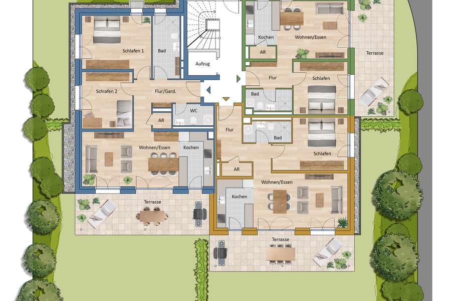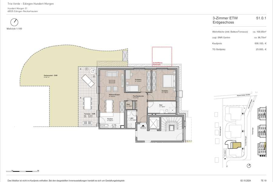 – Zwischen Hundert Morgen und Starenweg – Drei Mehrfamilienhäuser – 27 Eigentumswohnungen – 2 bis 4 Zimmer – Ca. 61 m² bis 132 m² Wohnfläche – Freiflächen mit Südwestausrichtung – Besonderes Energiekonzept Die drei Gebäude unseren neuen Projekts TRIO VERDE Edingen sind entsprechend ihrer Größe als Zweispänner bzw. Dreispänner mit Dachterrassen-Wohnungen geplant. Die Eingänge liegen jeweils an einem Quartiersweg. Alle Häuser haben einen Aufzug. Eine öffentliche Durchfahrt durch das Gebiet besteht nicht, sie ist nur Servicefahrzeugen und der Feuerwehr vorbehalten. Anbeiden Zufahrten befinden sich Besucher-Stellplätze. In der Tiefgarage sind 30 großzügige PKW-Stellplätze sowie Fahrradstellplätze vorgesehen, diese sind über eine gesicherte und überdachte Rampe gemeinsam erschlossen. Freuen Sie sich auf ein Wohn-Ensemble im Grünen, das modernes Wohnen und nachhaltige Architektur vereint.
